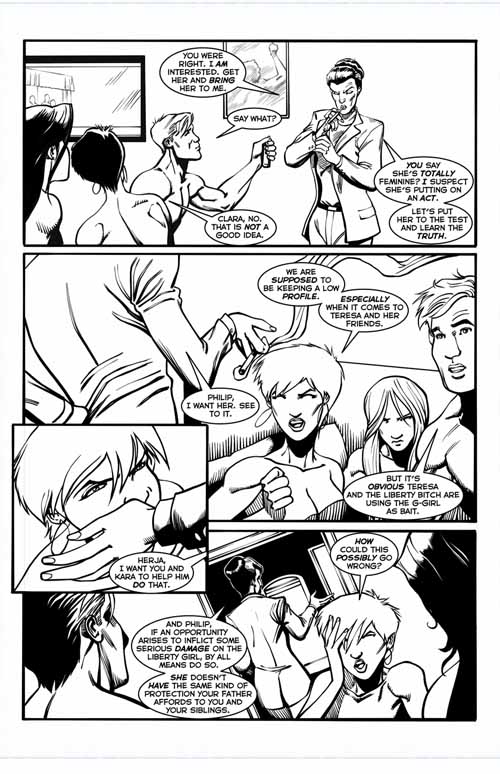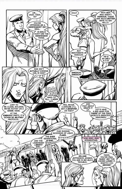 First, the G-Girl, Flare, and the Liberty Girl arrive in Korea on a mission to see if they can find out where the G-Girl's kidnaped mother is being held. This story is written by Dennis Mallonee, with artwork by Beniamin Delvecchio and Henry Martinez.