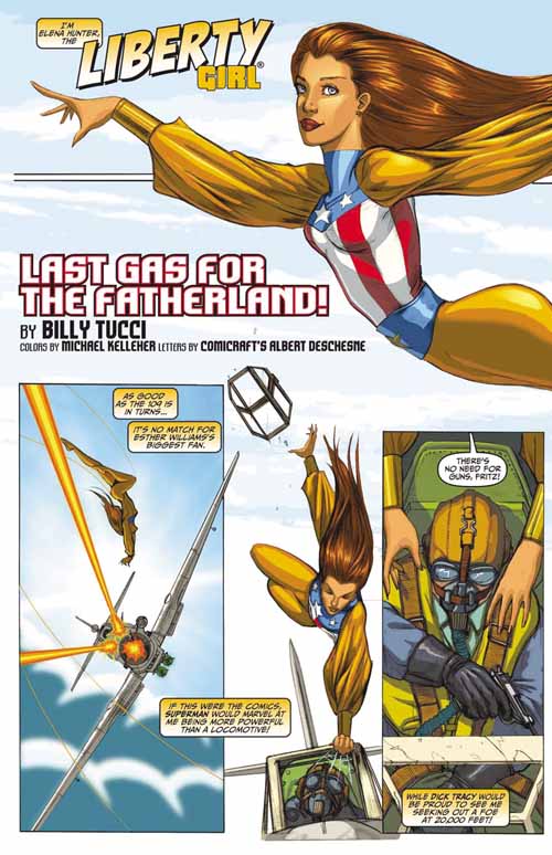 Those stories will be coming to you from a stellar array of talent. While the extraordinary Mark Sparacio provides us with the artwork for our first few contemporary tales, such talents as Billy Tucci, Roy Thomas, and Francesco Gerbino in this first issue, Mark Beachum Dick Giordano, Tim Burgard, Mike W. Barr, Henry Vogel, Mark Propst, Andrew Pepoy, Rob Jones, and Daerick Gross Sr (who, by the way, designed the Liberty Girl's costume) in issues yet to come will be contributing to the Liberty Girl's saga.